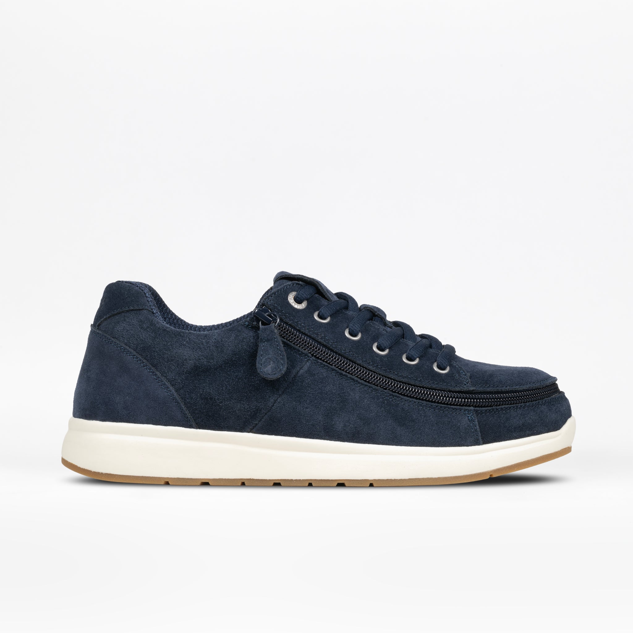 A Men's Navy Suede BILLY Comfort Plush sneaker by BILLY Footwear, featuring a white rubber sole, wraparound side zipper, and matching navy laces, displayed in profile on a plain white background for sensory-friendly comfort.