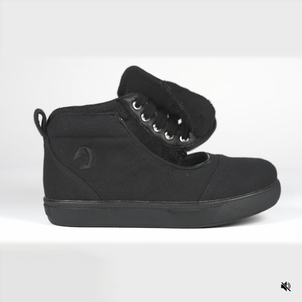 The BILLY Footwear Kids'/Toddler D|R II Short Wrap High is a black high-top sneaker with a flat sole, lace-up front, side zipper, and wide toe box, shown against a plain white background.