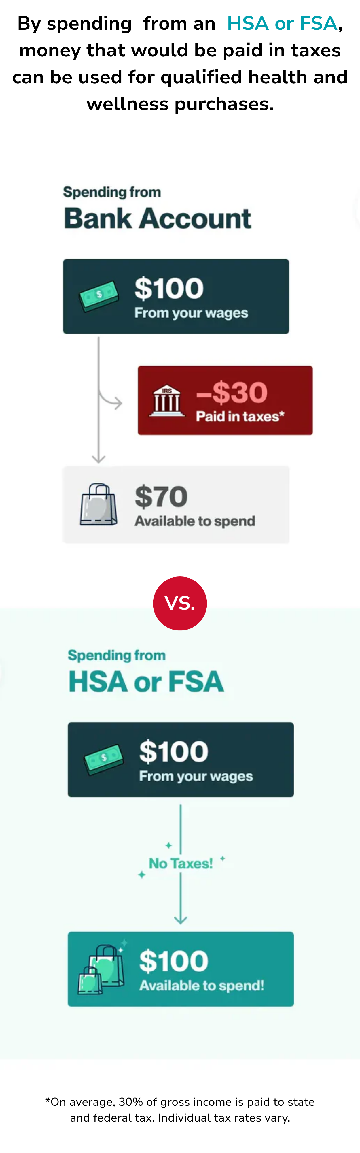 HSA/FSA accounts were created so individuals could use pre-tax money to pay for expenses used to treat, mitigate, or prevent a diagnosed medical condition. Because HSA/FSAs use pre-tax money, you’re getting more purchasing power for your dollars. Rather than pay taxes on income and then spend it on health items, qualified customers can use pre-tax funds to invest in their health.