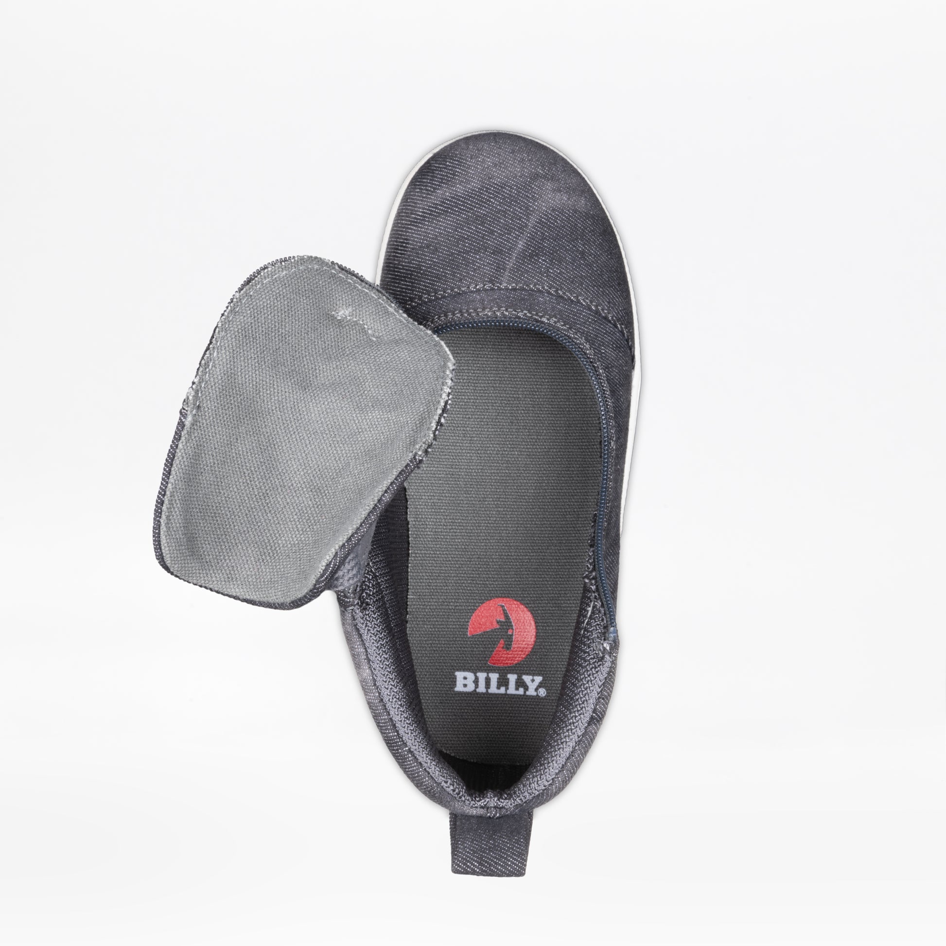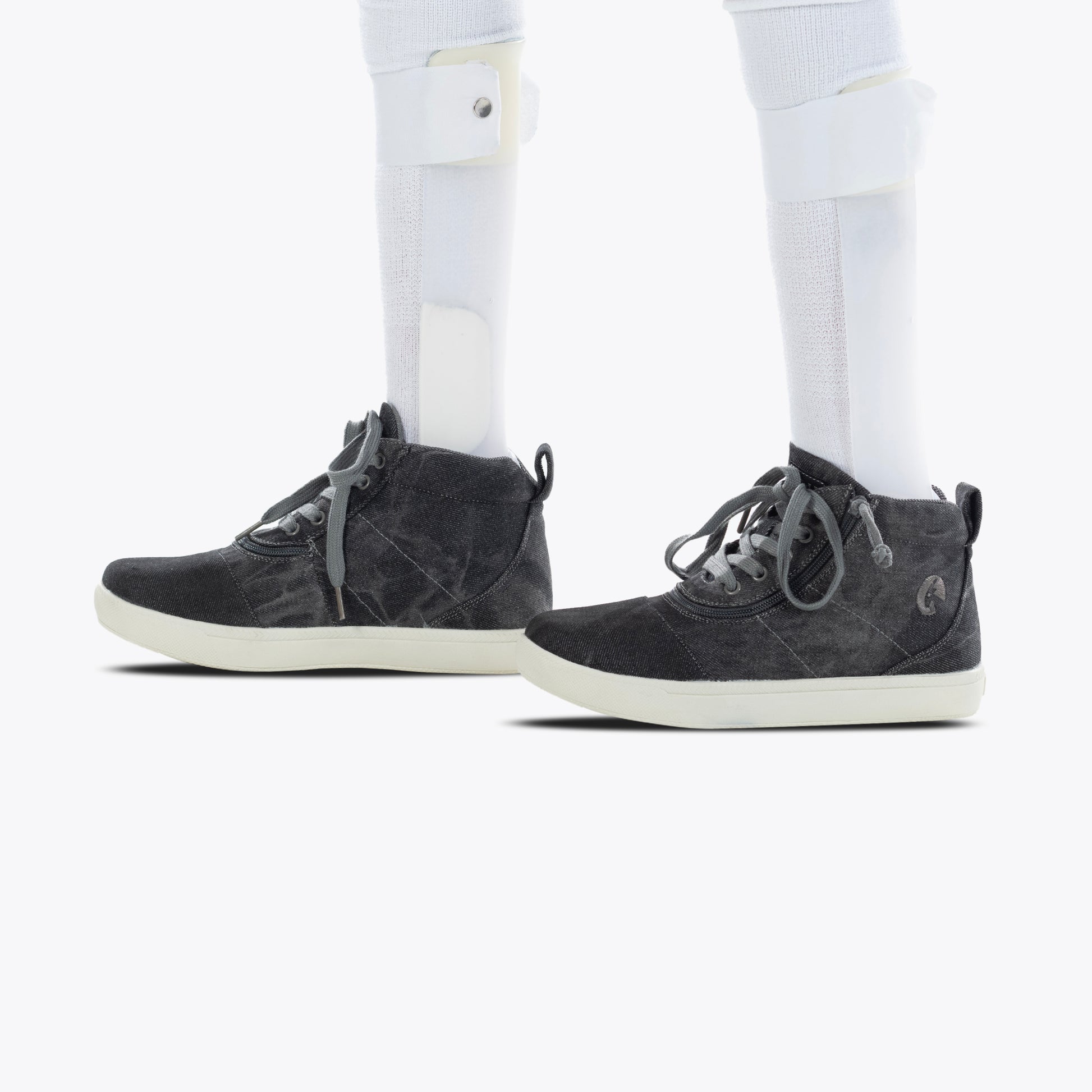 The Black Acid Wash BILLY D|R II Short Wrap High Top AFO-friendly shoes consist of three widths: Medium (MDR), Wide (WDR), and Extra-Wide (XDR). The laces on these shoes are functional for an adjustable fit. The thick knit polyester fabric upper lining adds durability for increased tear resistance. The short-wrap zipper closure allows for a traditional shoe toe, yet also maintains fun and easy entry into the shoe. The insole board and outsole rubber compound helps withstand toe and heel striking. And the two removable insoles (3mm each) provides adjustable depth for custom orthotics.