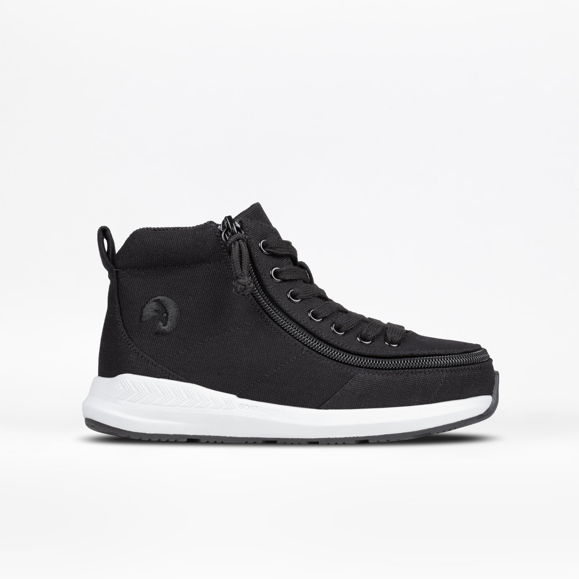 Step In! to innovation. Made in collaboration with Boston Orthotics & Prosthetics, the Black BILLY Goat Classic High Top AFO-Friendly Shoes are sure to provide the functional solution you have been looking for. Along with the full-wrap zipper for convenient donning and doffing, the Goat sets itself apart making it our most AFO-friendly solution.