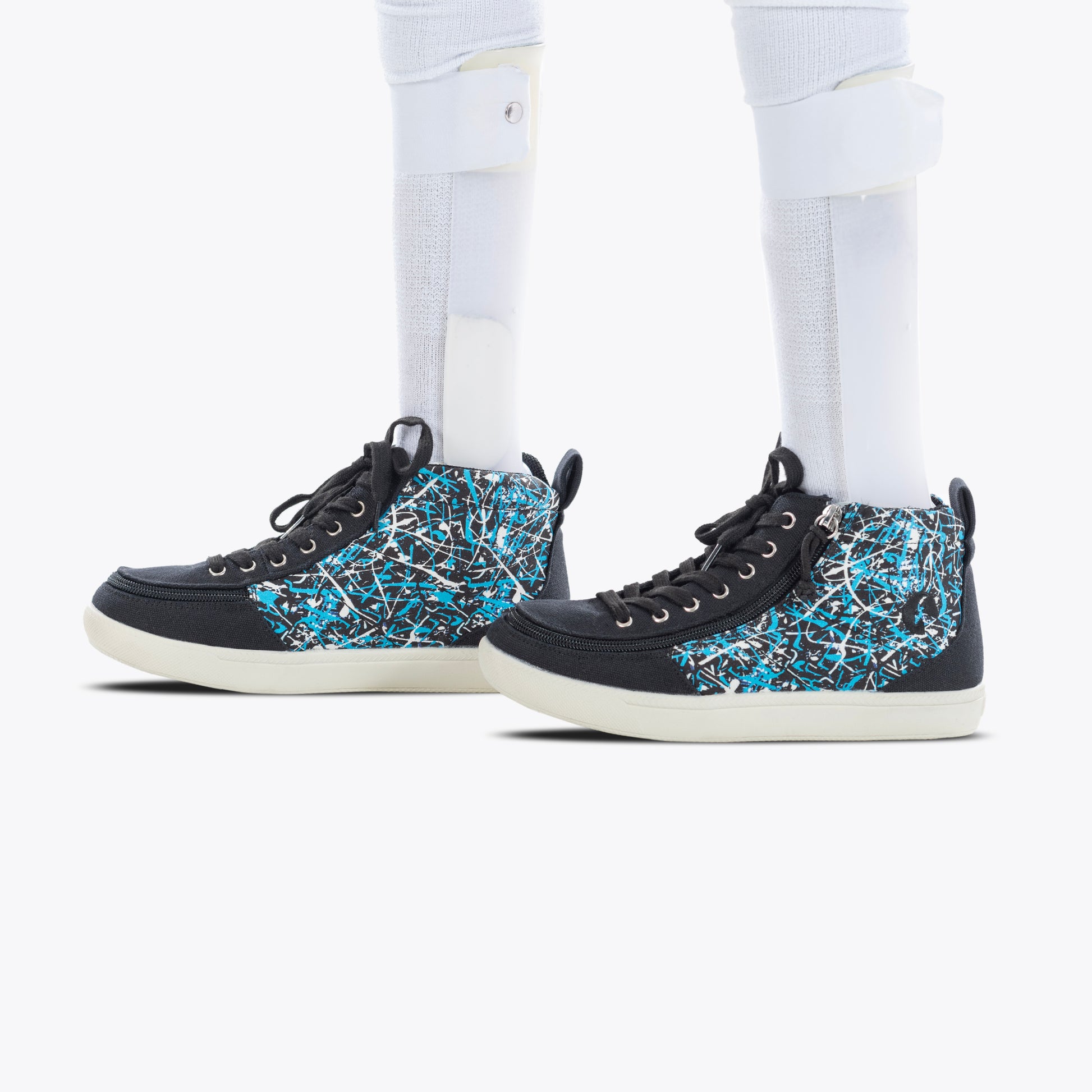 The Black Graffiti BILLY Classic D|R II High TopAFO-friendly shoes comes in three widths: Medium, Wide and Extra-Wide. The laces on these shoes are functional for an adjustable fit. The thick knit polyester fabric upper lining adds durability for increased tear resistance. The full-wrap zipper closure allows for unobstructed fun and easy entry into the shoe. The insole board and outsole rubber compound helps withstand toe and heel striking. And the two removable insoles (3mm each) provides adjustable depth for custom orthotics.