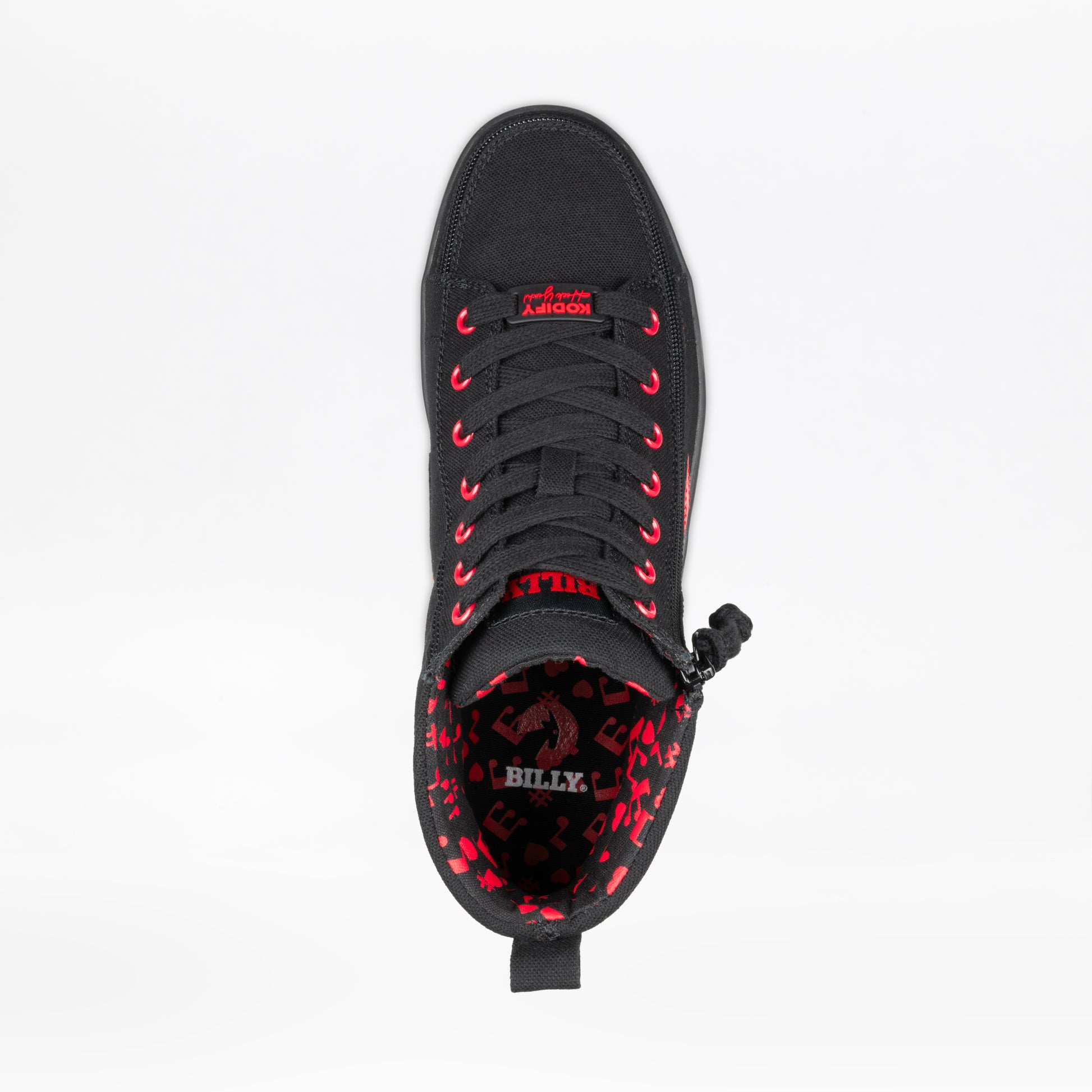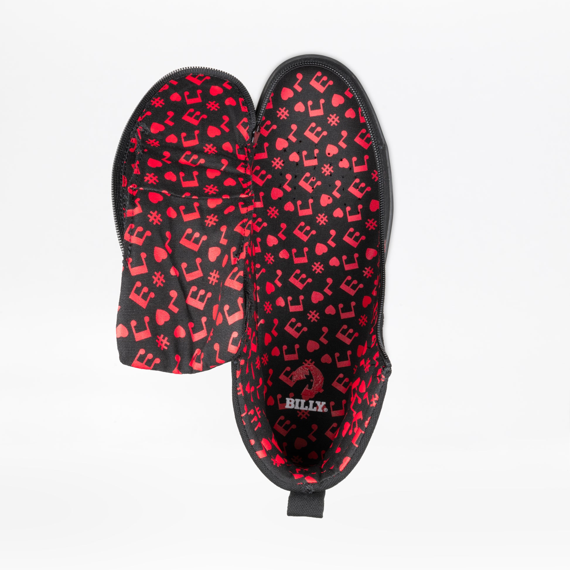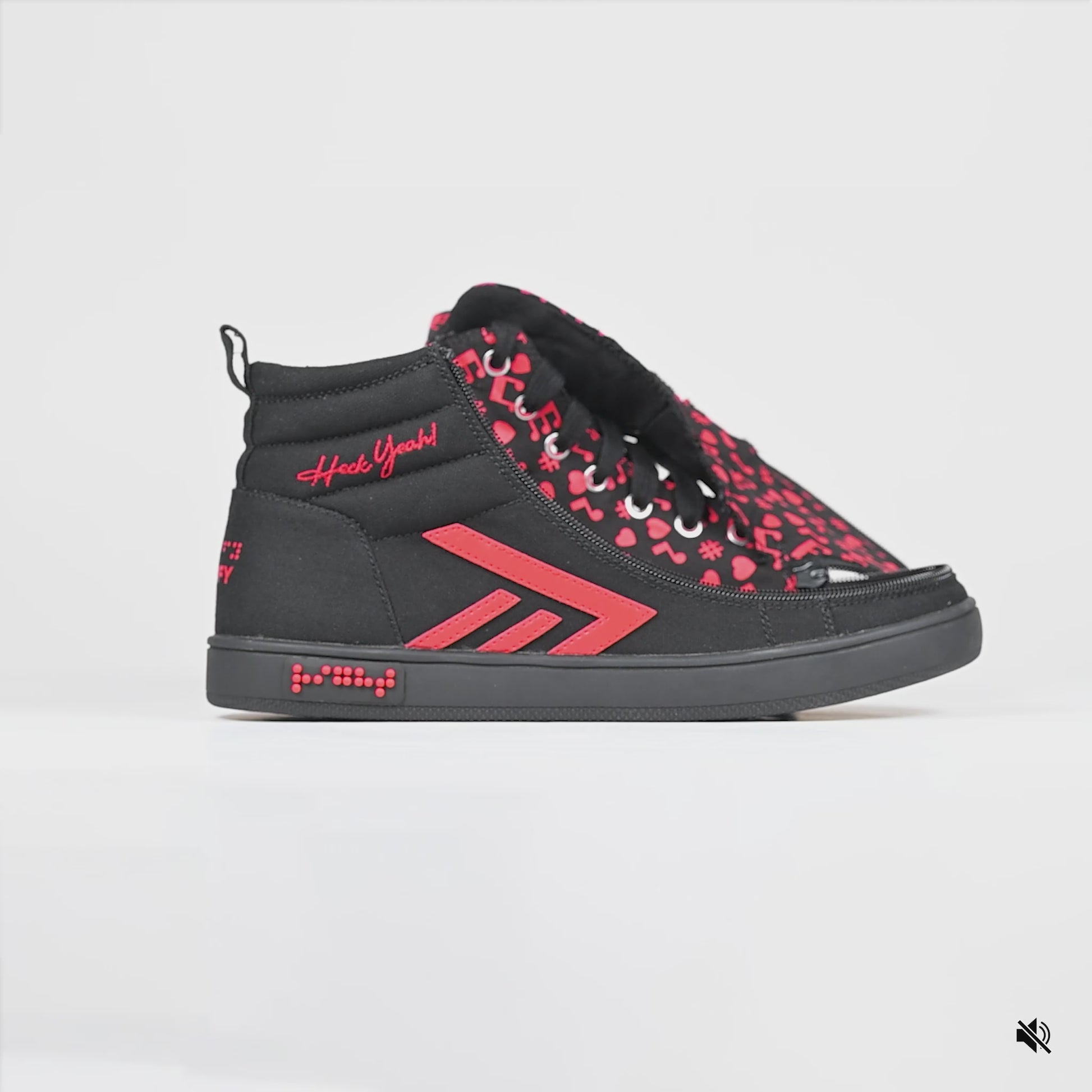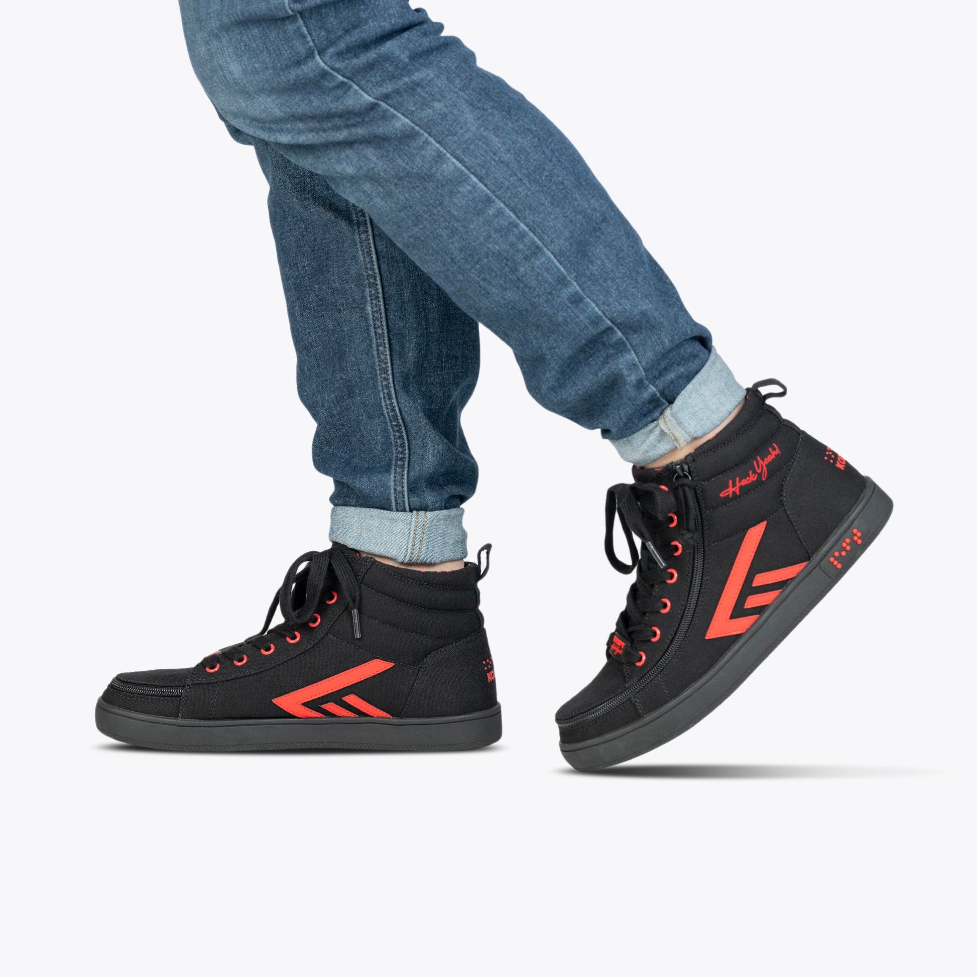 Designed in collaboration with Kodi Lee, singer, songwriter, and Season 14 winner of America’s Got Talent, the Men's Kodify Black BILLY CS High Tops are a silhouette to behold. With the bold black, vibrant red, highlights, braille on the outsole, and the BILLY iconic wraparound zipper for unmatched convenience, you are going to love these shoes. Coming with functional laces for a custom fit and removable insoles for added depth, the shoes are all the more inclusive. Heck Yeah!