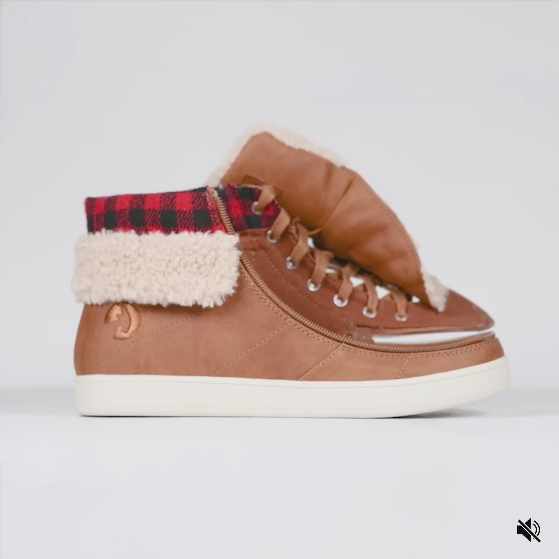 A trendy look to the Classic High Top, the Women's Cognac BILLY Cuff high tops are sure to receive compliments. Combining fashion with function, Step In! unobstructed in seconds. These flannel and faux suede kicks have a soft feel and fur collar for extra comfort. Use the functional laces to get the fit right, and then use the wraparound zipper henceforth. And with the multi-density foam and silica gel insoles, you'll have cushion where you want it and support where you need it. Enjoy!